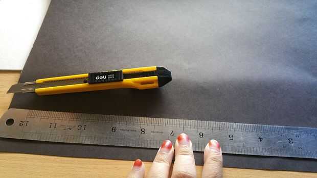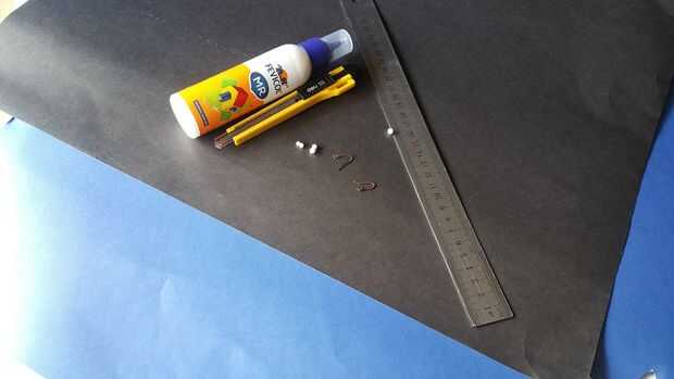 Para esto estoy usando la tarjeta papel (negro y azul, pegamento, escala, espuma de poliestireno, anti corte. Al primer corte papel quilling con escala y anti corte