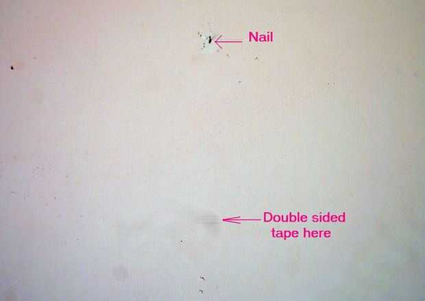 El primer paso es Martille un clavo en la pared. No me debe, pero por suerte había dos clavos ya en esa pared. Así que decidí hacer una repisa colgante en un solo clavo. Para mantenerla constante cinta adhesiva se fija a la pared en lugares estratégicos. Esto ayuda a la plataforma a permanecer en el lugar incluso cuando carga desigual.