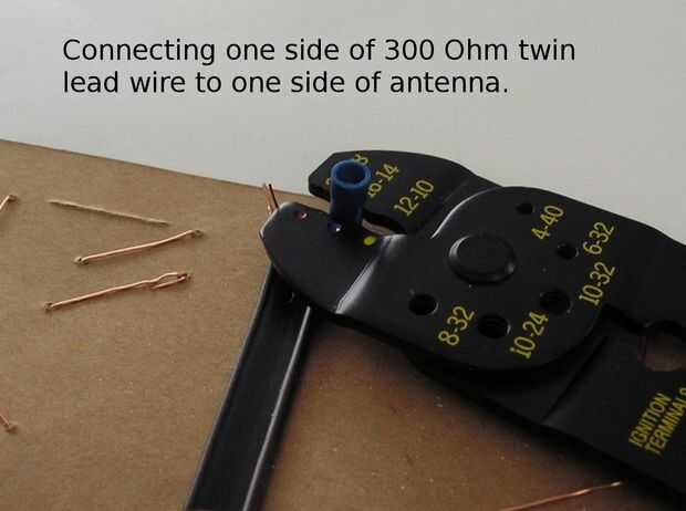 La mejor manera de conectar el cable de bajada o transformador en línea a la antena es tuerza los alambres pelados del transformador lead-in/coincidencia con los alambres de final de la antena y las dos conexiones de la soldadura. Si no tienes un soldador y soldadura, la siguiente mejor conexión se hace mediante conectores de presión y una crimpadora o pinzas.