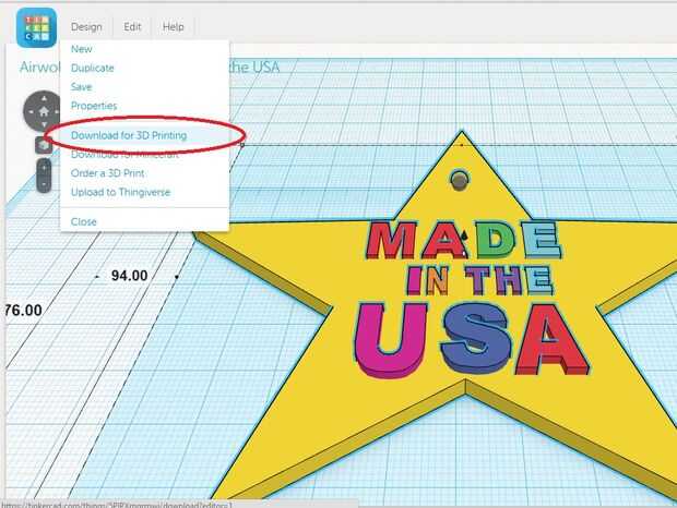 He diseñado este modelo con un software fácil de usar llamado Tinkercad. Sólo tomó 2 minutos para inscribirse para una cuenta gratuita. Lo primero que hice fue arrastrar una estrella (de la derecha) de la red. Re-de tamaño la estrella entonces comenzada a arrastrar y soltar las letras. A continuación volver a de tamaño las letras. Finalmente exporta el modelo en formato STL haciendo clic en la barra de menú superior de la izquierda: