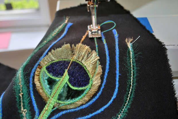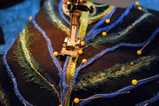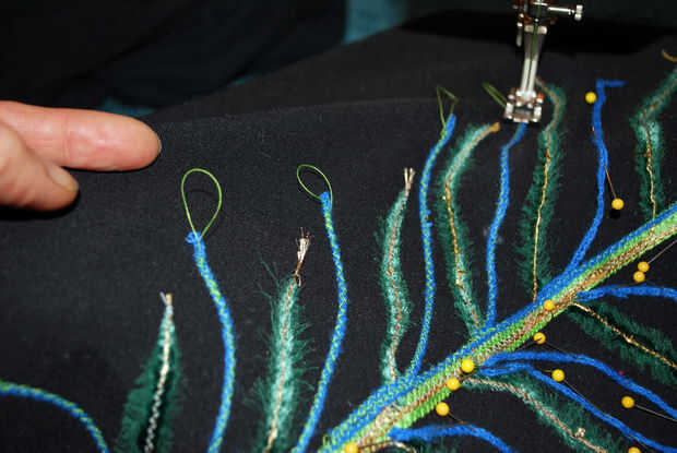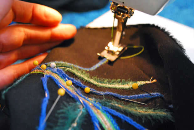 Utilizando una puntada de zig-zag estrecho en la máquina de coser, coser por los hilos azul, quitando los pernos como ir. Al final de cada hoja azul, me permito un pequeño hilo extra antes de bucle hacia atrás para coser la cadena dos veces. Esto asegura que todo permanece en su lugar y me da hilo extra que puedo cortar en "colas" para cada fronda.