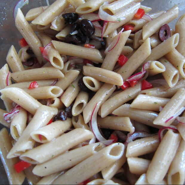 Cuando estaba en la Universidad, tuve un amigo que se fue a vivir con su hermana en Calgary para un verano. Trabajó en un café y trajo esta receta de ensalada de pasta. Es super fácil y muy delicioso. Cada vez que yo lo he servido, he tenido comentar