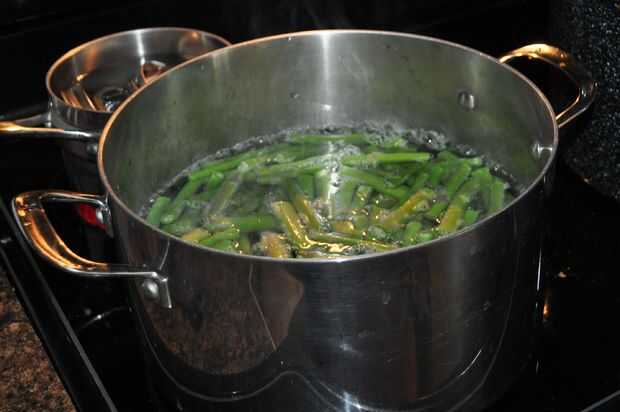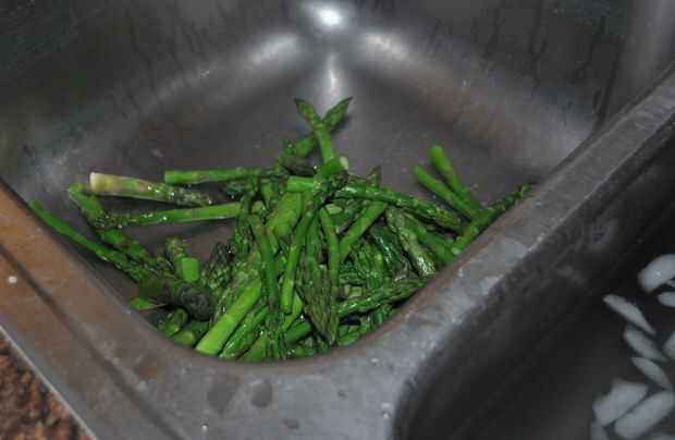 Blanquear sus espárragos en agua hirviendo durante 10 segundos y luego coloque en agua con hielo.