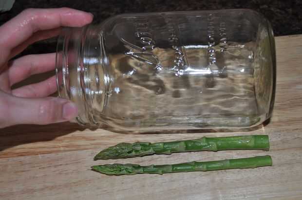 Cortar espárragos a la jarra. Cortar lo suficientemente corto como para que cuando descansan en la jarra hay es aproximadamente 3/4 de pulgada hasta el borde. Guardar los fondos de los espárragos para otro uso.