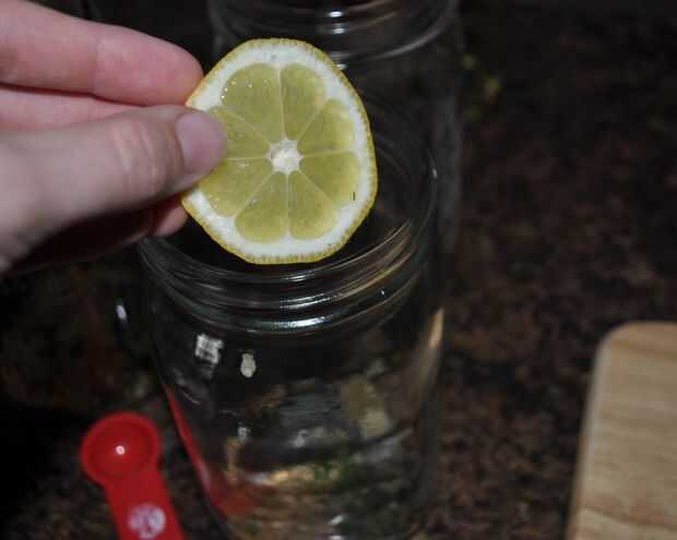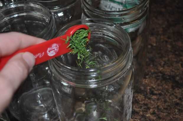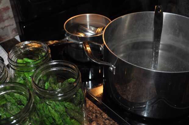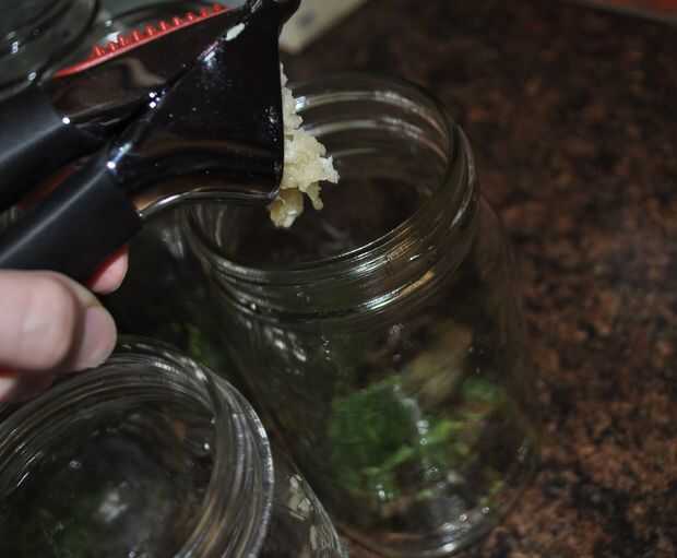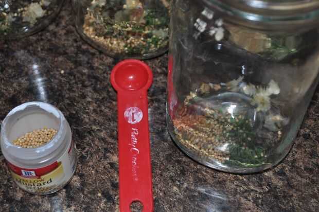 Llenar cada frasco con semillas de 1 cucharadita de mostaza, 1 cucharadita de eneldo fresco picado, 1 diente de ajo entero o en trozos pequeños, 1 rodaja de limón. Después el paquete los tarros con espárragos blanqueados. Me gusta punta para arriba pero no importa.
