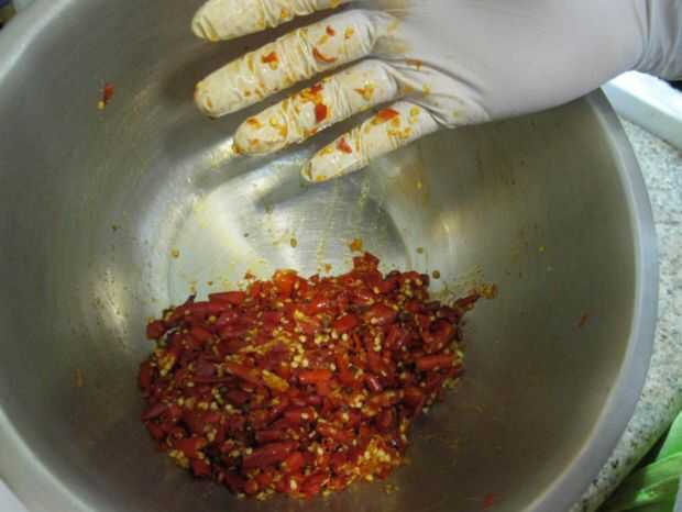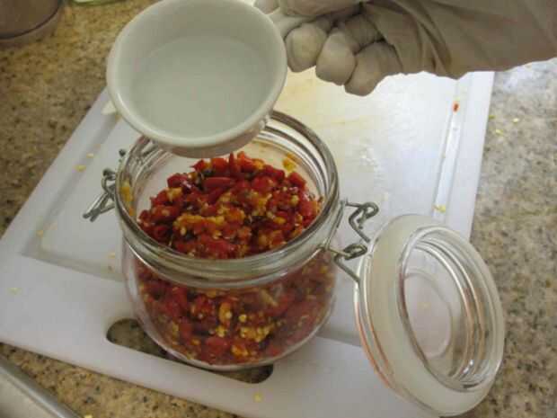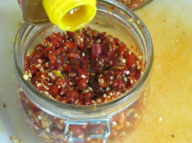 Transferir el Chile un frasco sellado, agregar blanco licor fuerte (para evitar que las bacterias) y aceite de sésamo para cubrir el chili (opcional pero altamente recomendable).
