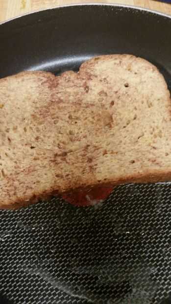 rápidamente tus rebanadas de pan en el bol de la inmersión poner en la cacerola y cocinar hasta que estén doradas por ambos lados. Repita los pasos con cada rebanada de pan.