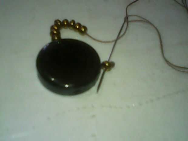 Una vez que han sacado su hilo y la aguja por el agujero opuesto (punto #2) de su gran grano comience a agregar los granos de la semilla para que tenga suficientes granos para llenar el espacio entre el punto #2 y la primera de semillas de bolas (punto #1).