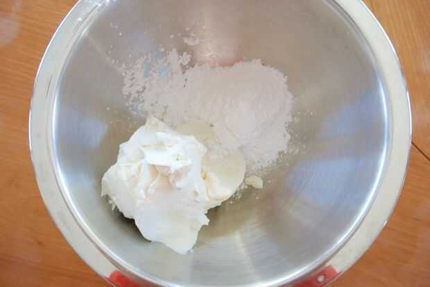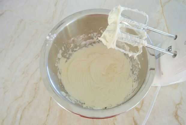 Batir el queso crema ablandado, la vainilla y el azúcar en polvo hasta esponjoso y suave.