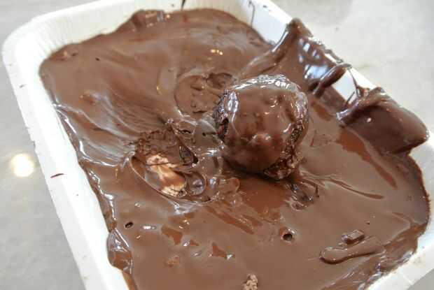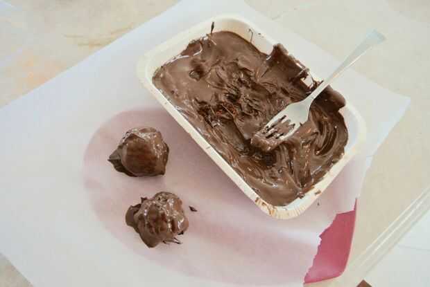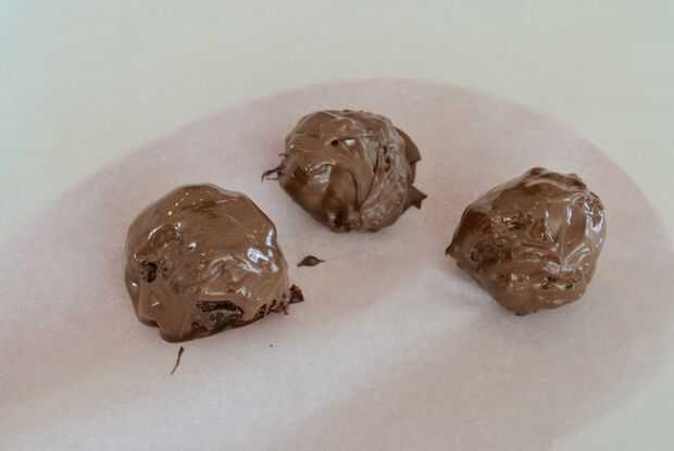 Mojar primero las partes inferiores de las trufas, de esa manera tienes una buena base. Una vez que han endurecido en el papel de pergamino, sumerja las mitades superiores de las trufas. Utilice una cuchara para salpicar el chocolate en las restantes áreas. Realmente no tiene que parecer perfecto, porque la rosa en la parte superior cubre todo.