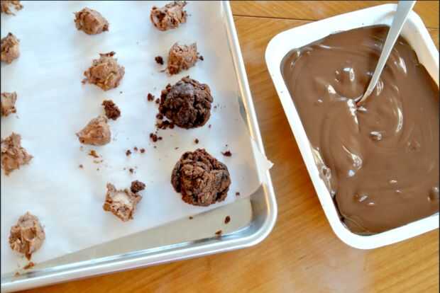 Una vez que se forman las trufas, que necesitamos cubrir de chocolate. Me parece comprada se funde chocolate para ser más fácil, pero funciona de chocolate templado, también.