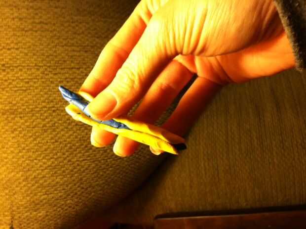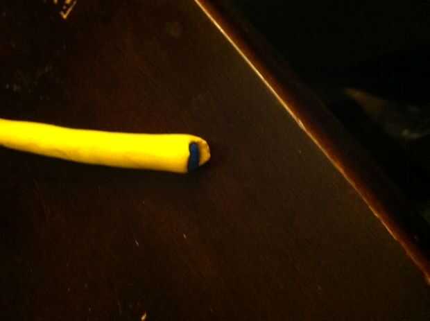 Coloque el SUGRU azul en el centro del amarillo y doblar los bordes juntos para todo lo que ver es de color amarillo. Rodillo de los tubos suavemente para que la capa exterior es liso, pero no rollo lo suficientemente fuerte como para que los colores se mezclan.