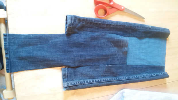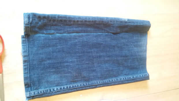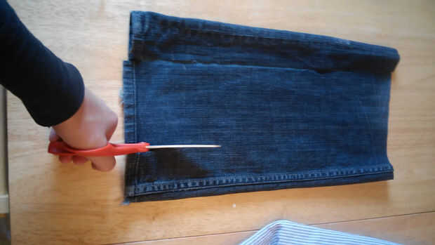 Primero cortan una pierna de mi jeans viejos. Luego corté una pequeña sección de los pantalones vaqueros para poder ampliar el ancho de la bolsa de basura y añadir un toque un poco.