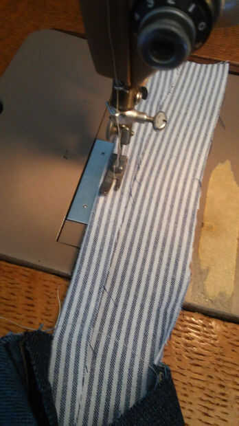En este punto tenía dos trozos de tela que sobresale del extremo de la bolsa. Transformó en la manija por primera el dobladillo de los lados de la tela doblándola y coser.