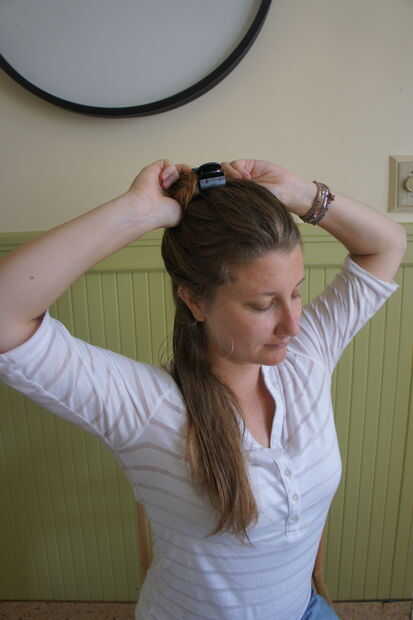 Me gusta mi pelo se dividen en tres segmentos horizontales. Uno en la corona de mi cabeza, uno de la corona en la parte inferior de las orejas y el último de la parte inferior de las orejas hasta la nuca. Poner las dos primeras secciones en un moño y asegúrelo con una abrazadera. Puede dejar la parte inferior hacia abajo.