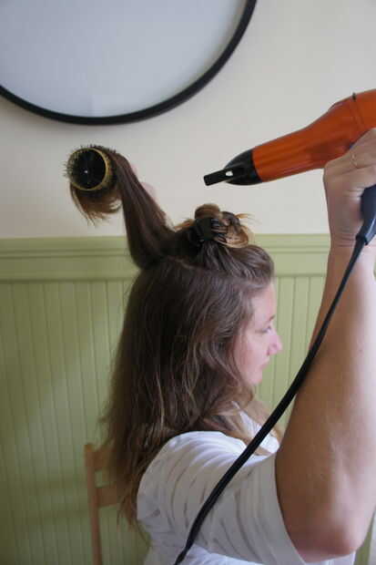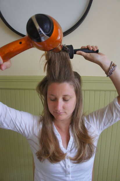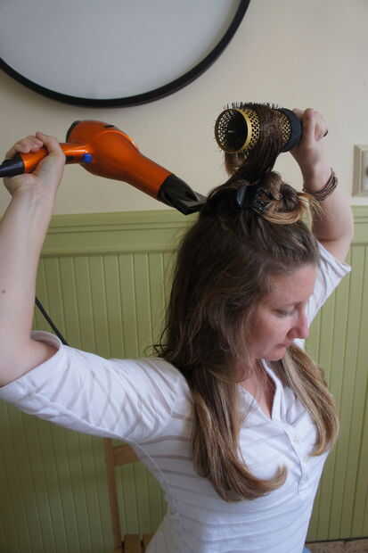 La sección de corona es donde el volumen es el más importante así que estén utilizando la tensión con el cepillo y dirigiendo el cabello hacia arriba. Comienzan con las raíces y el golpe seco de la parte posterior y del frente, movimiento hacia el eje medio y luego los extremos.