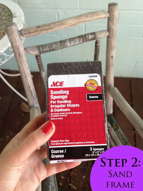 El marco de la silla, teniendo especial cuidado, suavizar las zonas "tangibles", como los brazos de la arena.  Utilice papel de lija apropiado para el material del marco.  Opté por usar esponjas de lijado para obtener alrededor de los contornos de la madera.  Mi silla tiene un estilo rústico, para no tener que hacer ultra suave.