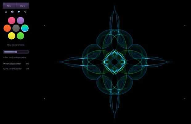 Ahora terminada nuestra ilustración sobre todo, es posible llevar al siguiente nivel y poner más interés visual a él. Lo hice poniendo efectos de pintura generativa de luz creado con el libre applicationSilk en línea interactivo arte generativo. La seda es muy fácil de usar en el navegador web. En los controles es posible configurar colores, el tipo de simetría y encender y apagar el 'espejo a través del centro' y 'Espiral hacia el centro de' opciones.