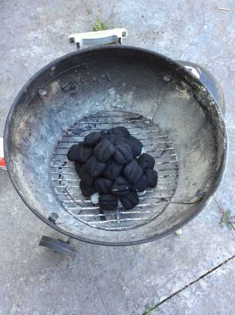 Pila de briquetas en pila aseada en el centro de barbacoa. Luz según instrucciones que se encuentran en paquete del carbón de leña.
