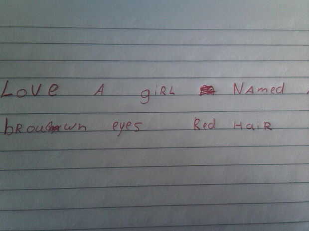 te gusta una chica en la escuela su nombre es Amy {Am} y sabes ella tiene ojos de pelo rojo, marrón y le encanta la música, {lento canciones rocas y pop como: credo, 3 puertas abajo enc}