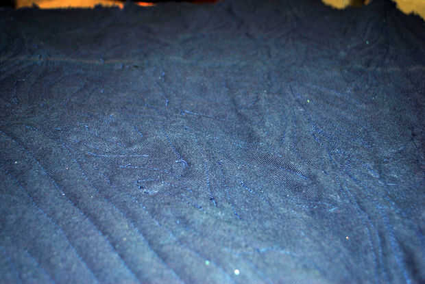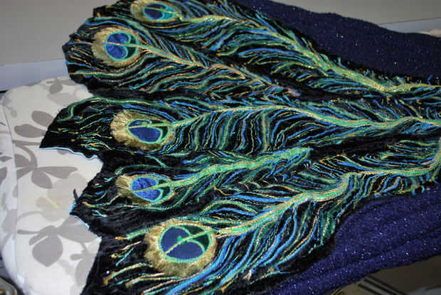 Una vez todo acolchado abajo, me recta Puntada alrededor de las puntas de pluma. I mantener simple y coser a una especie de forma de cúpula de cebolla alrededor del ojo de cada pluma, manteniendo aproximadamente un 1/2 pulgada fuera de las hojas plumosas. Levante con cuidado el terciopelo y azul punto a tejido de la tela cruzada del forro y recortarlo muy cerca de mi línea de costura.