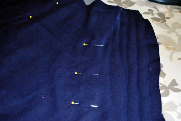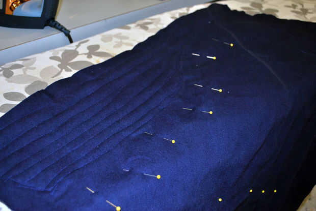 Las crestas acolchadas exteriores son bastante fáciles de coser. La parte emplumada de la silla es más complicada y necesita estabilizar más, así que aquí es donde sale de clavos. Pin aproximadamente 2 pulgadas de mis líneas de puntadas anteriores, alisando hacia fuera la tela cruzada como ir. Gire el asiento a la parte delantera y coser dos o tres crestas hacia abajo, cortar mis temas y luego dan la vuelta otra vez por lo que puedo mover mis pines más cercanos al centro del asiento.