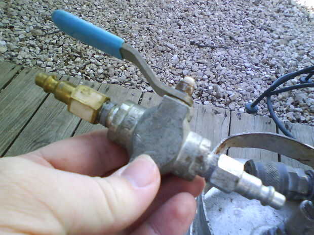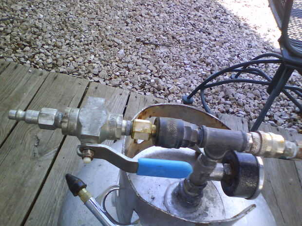 Ya que mi compresor de aire está a sólo 2 galones y im a pie para comprar una más grande, convertí un viejo tanque de gas propano en un tanque de aire.CONSTRUIR A SU PROPIO RIESGO!AIRE COMPRIMIDO ES MUY PELIGROSO Y POR LO TANTO ES PROPANONO ES MI CUL
