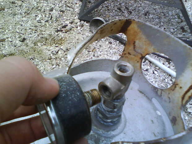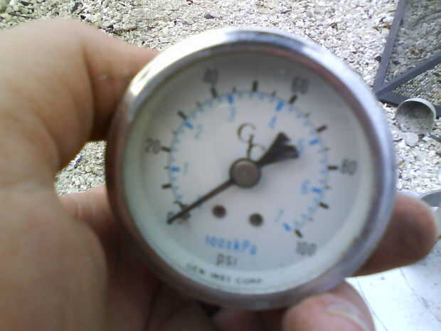 Junturas aplicar alrededor de roscas y tornillos en el manómetro de aire. Apriete con una llave a donde el texto es legible y no desproporcionado. Usé un 0-100 PSI pero mayor es aceptable. El compresor que yo uso sólo pone 115 PSI.