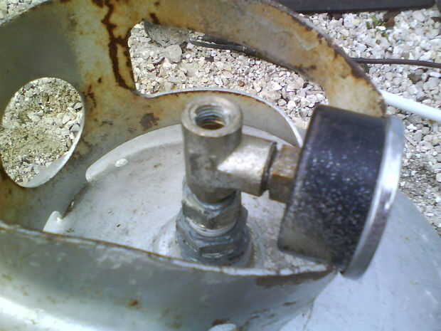 Ya que mi compresor de aire está a sólo 2 galones y im a pie para comprar una más grande, convertí un viejo tanque de gas propano en un tanque de aire.CONSTRUIR A SU PROPIO RIESGO!AIRE COMPRIMIDO ES MUY PELIGROSO Y POR LO TANTO ES PROPANONO ES MI CUL