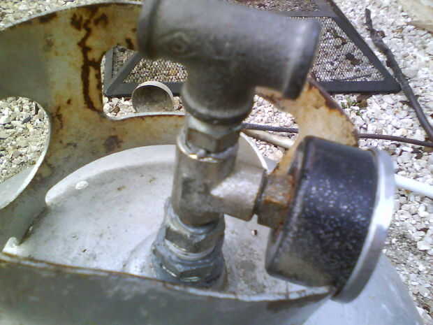Ya que mi compresor de aire está a sólo 2 galones y im a pie para comprar una más grande, convertí un viejo tanque de gas propano en un tanque de aire.CONSTRUIR A SU PROPIO RIESGO!AIRE COMPRIMIDO ES MUY PELIGROSO Y POR LO TANTO ES PROPANONO ES MI CUL