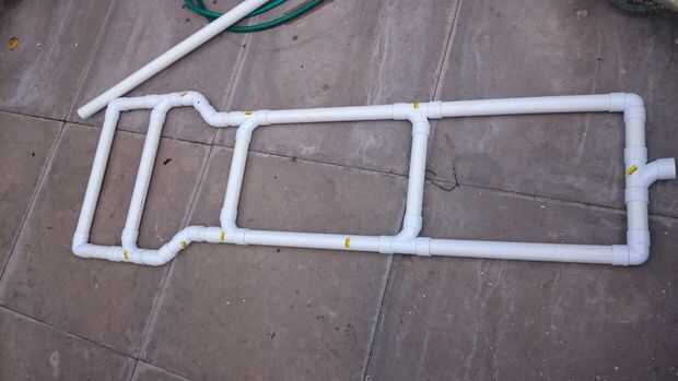 No estoy intentando de hacer esto un plan definitivo, como sus requisitos de espacio y tamaño de bicicletas puede diferir de la mía pero necesitaba una longitud total de 1500mm y una anchura de 500mm para la cabeza de la estructura. Pensé que era mejor no hacer el marco cuadrado en caso de que causa demasiada flexión en lo que es un material flexible ya por lo tanto, la forma "talle". Del mismo modo no quería demasiados largos así que construí miembros de la cruzados a intervalos regulares, como puede verse en la tercera foto.