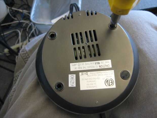 Use un destornillador para desmontar la base y cortar los cables que conectan el cuello de la lámpara a la base. Los tornillos de la base se encuentran por debajo de las patas de goma en la parte inferior de la base.