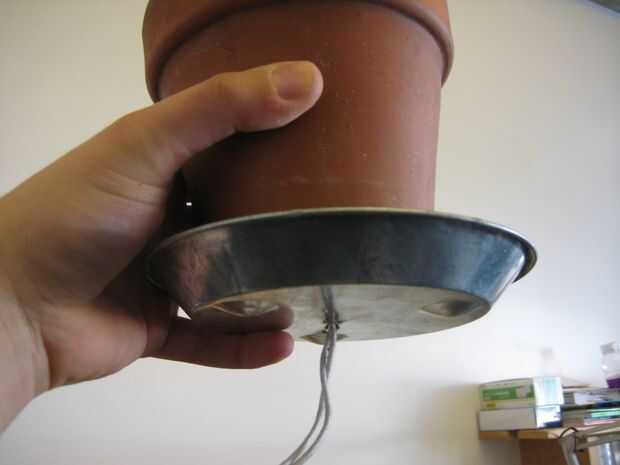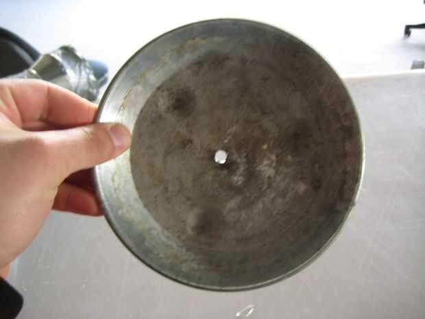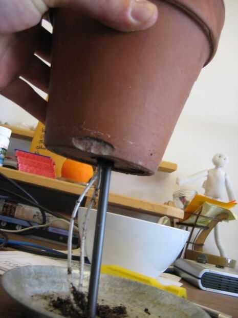 Luego, tomar un taladro y hacer un agujero en la parte inferior del platillo de la planta. Si es cerámica, puede todavía perforar, sólo tienes que ir lentamente, no empujar demasiado duro y poner algo de agua en la broca ya que trabaja su manera a través. Mina pasó a ser de acero galvanizado, por lo que era fácil de perforar.