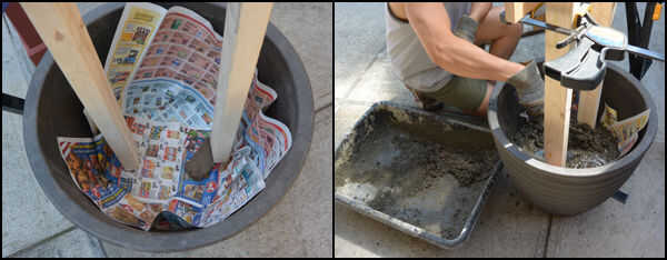 Ahora, vamos a fijar el soporte en hormigón para crear una base estable y agradable. En primer lugar, la línea su olla con algunos periódicos. Coloque el soporte en el centro de la maceta, tratar de conseguir el soporte como recto y nivelado posible, pero sin necesidad de ser exacto - después el concreto, aún tendrá sala de meneo, porque el periódico mantiene el concreto se pegue a la olla. Siga las instrucciones para la mezcla de concreto, luego verter en la olla y deje que. Consejo: Si utilizas una mezcla de fraguado rápido como Sakrete rápido ajuste concreto, no incluso tienes que mezcla preparada de antemano. Simplemente Vierta la mezcla seca en la olla, añada agua y dejarlo establecido.