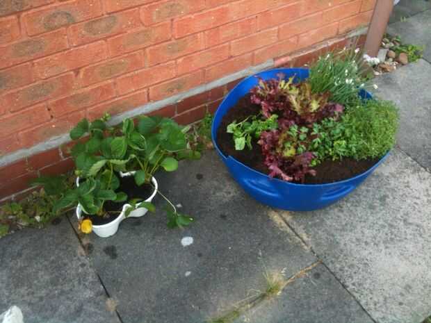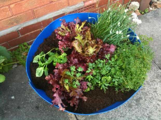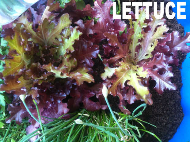Tuve todas las hierbas y lechugas en macetas pequeñas y tienen mucho más espacio para crecer en la olla grande, lleno sobre a la mitad con compost y luego plantan hierbas y lechugas. Luego añade más compost alrededor de ellos y regado.