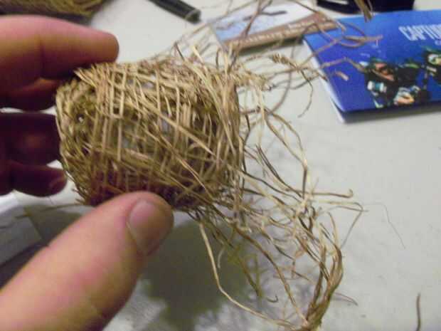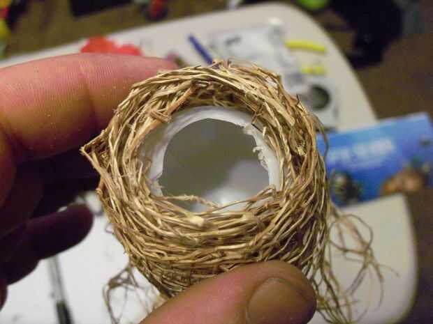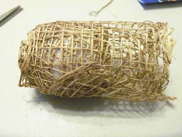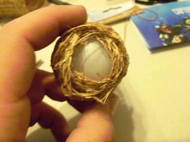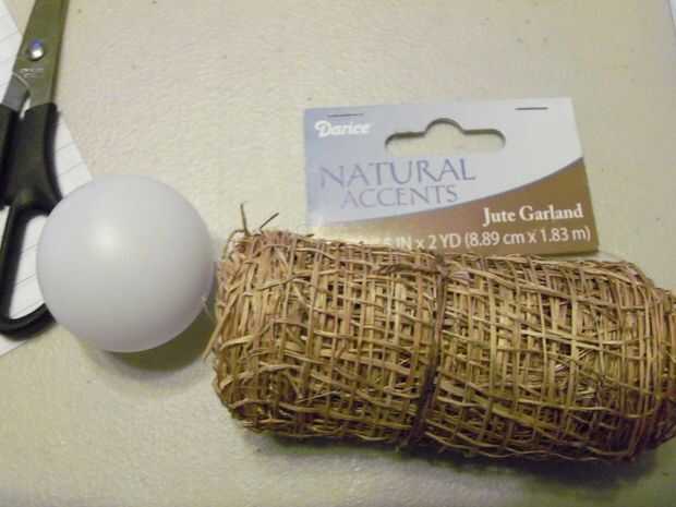 A continuación se desenrolla lo de yute y envolver la bola completamente dejando sólo la parte superior con el orificio expuesto. Pegar el borde suelto hacia abajo y cortar el resto del rollo, no necesita todo el rollo. Debe haber un poco de yute colgante de la bola abajo. Con las tijeras corta en algunos lugar pero apenas así que usted puede deshilacharse con facilidad.
