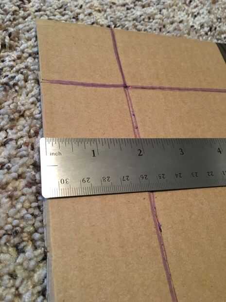 Coloque la regla en el borde de la cartulina y utilizar el utensilio de escritura para hacer una pequeña línea en la 2" marca. Repita este paso para los cuatro lados. A continuación, utilice la regla para dibujar una línea recta a cada lado perpendicular al borde de la cartulina y 2" hacia adentro del borde. Ver la imagen de arriba para obtener un ejemplo de donde deben colocarse las líneas.