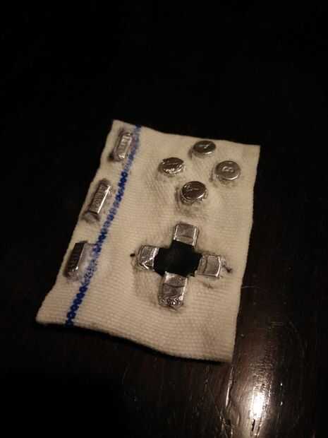 Corte agujeros en la banda para colocar los botones. Para este paso de poner la banda en la pantalla con su juego en forma puede marcar donde se deben colocar los botones. Proceda a cortar los agujeros y pegar los botones.