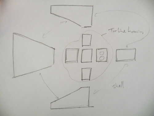 Sin necesidad de detalles aerodinámicos en una prueba de concepto, por lo que esto está hecho de paneles de madera contrachapada. La torre que contiene las turbinas fue construido como una sola unidad, pero para portabilidad, la cáscara se iba a celebrar junto con ataduras de cremallera y espacios de aire sellados con cinta adhesiva.