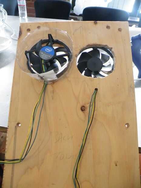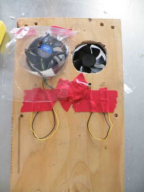 Para asegurarse de que el aire fluye en una dirección a través de cada ventilador, una válvula simple que consiste en una hoja de polietileno bolsa pasa a través del lado de enchufe de los ventiladores. Además de eso, resulta que estos ventiladores particular spin feliz cuando sopla a través de ellos una forma de aire y twitch apenas cuando el aire sopla a través de la otra manera.