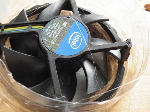 Desafortunadamente, el marco del ventilador no coincide con para arriba con la mejor dirección para soplar el aire, así que tuve que agregar conductos alrededor de los ventiladores para dar un extremo plano de la válvula de cierre. El conducto fue simplemente una corta sección de la botella de refresco, que sucedió a de diámetro.