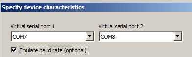 Seleccione un número para cada puerto serie. El número de puerto debe estar libre en su sistema. Hemos creado a COM7 y COM8. Se revisaron los baudios de emular, aunque probablemente no es necesario. Haga clic en Aceptar.