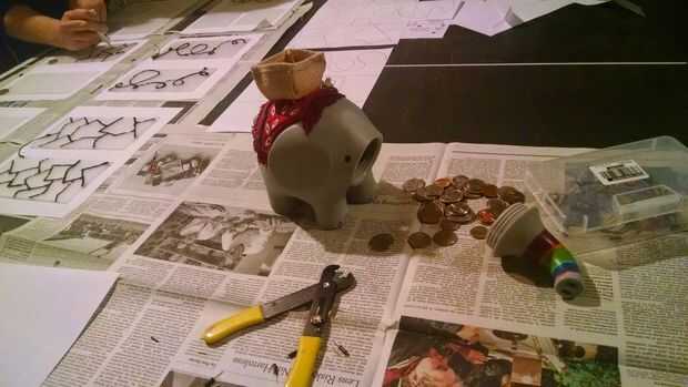 Para cada lado de cada sombra, tira el extremo de un alambre y sandwich en la pintura en la parte inferior del lado de la sombra. Si usted necesita un peso para sostener el alambre, pequeño cambio funciona bien, como usted puede ver en la imagen. (No elefantes reales fueron perjudicados en el proceso de fabricación de estos).