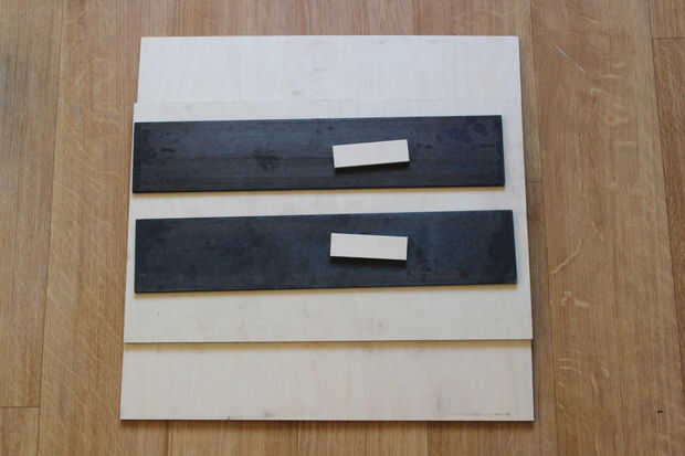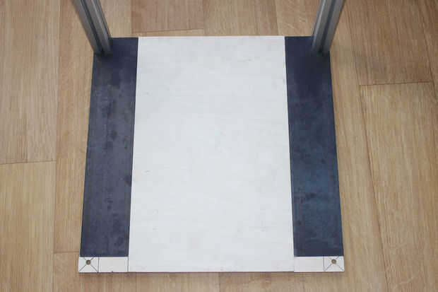 Comienzo perforando dos 10 mm agujeros de dos cm de la frontera en las placas de acero, como se muestra en las fotos. Luego Taladre cuatro agujeros de 20 mm en la placa de madera grande. La distancia de la frontera también es 20 mm. pegamento el acero de las placas a la placa de madera como se muestra en las fotos. La placa de madera trabaja como un soporte de distancia y evita que los tornillos de rayar el piso.