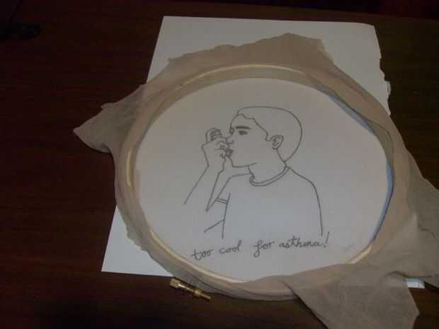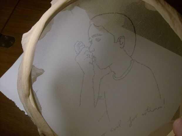 Una vez terminada dicha tarea, tomar la imagen tiene a imprimir (o si tienes una mano firme). Lugar el aro de bordado hacia abajo contra la imagen, para que la tela es directamente contra su dibujo y utilizando un lápiz, trace suavemente la imagen hacia la tela. Recuerde, suavemente seguimiento es vital. He sabido por experiencia que si usas nylon viejo, la tela puede rasgar fácilmente.