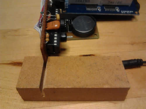 Para esto primero utilicé una pieza de MDF o madera. Es fácil poner el PCB en la línea Sierra en la madera. En vez de madera también se puede hacer un "pie" con un pedazo de metal.
