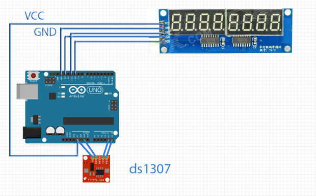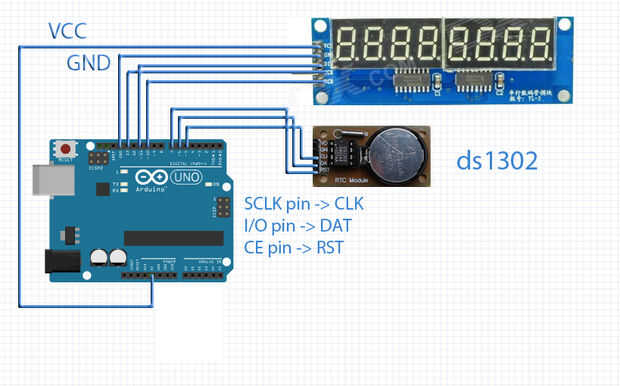 Ya tengo dos dispositivos de tiempo, uno con un ds1302 y otro con un ds1307, las conexiones con el módulo de temporizador pueden ser diferente. También hay dos scripts en el repositorio, dependiendo de su módulo de tiempo, porque utiliza de ds1307 I2C y ds1302 utiliza una conexión de 3 hilos.