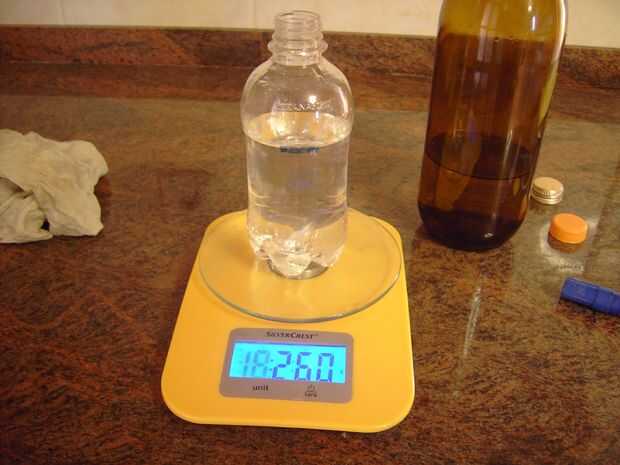 Poner la botella de 33cl en una báscula y llene la botella con agua. Marcar los niveles en 260 y 280 gramos. Vacíe la botella después de hacerlo.
