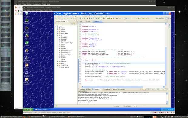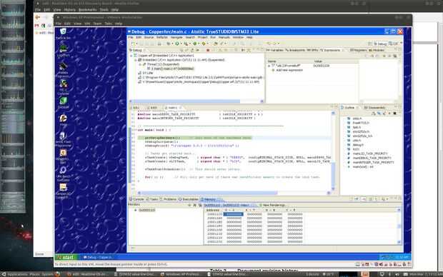 No estoy seguro acerca de IAR o Keil, pero Atollic no funciona en Linux. Tampoco se ejecuta bajo Wine, me han dicho. Sin embargo, sólo fino corriendo en Linux dentro de un equipo WinXP virtual de VMWare. La captura de pantalla siguiente muestra WinXP funcionando en una ventana con Atollic ejecución dentro de eso. Tiempo de construcción total es de 20 segundos después de una "limpia". No está demasiado mal. Bueno, creo que hace falta decir, pero escucho que atollic también funciona bien en Windows también. Si es necesario.