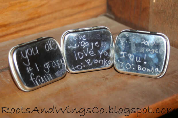 Latas de mis hijos dicen "Eres #1 Grapa from___", "Love You" y "I (corazón) U!".